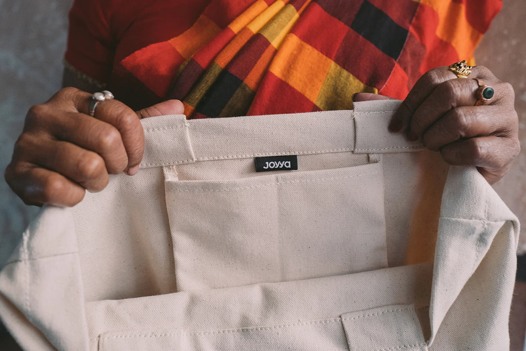 Det är flera år sedan vi gjorde en första beställning och fick hem små, snygga necessärer som sytts här, och sedan dess har jag velat beställa mer, samarbeta tätare, besöka och höra allt. Vi kikar upp på det färgglada huset, släpps in av vakten och står mitt i ett flervåningshus med en ljusgård i mitten. Det är här vi ska få träffa Rahul.