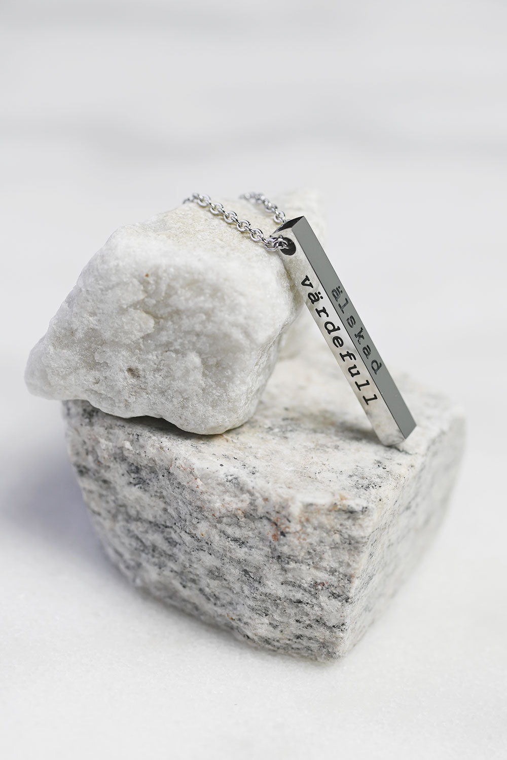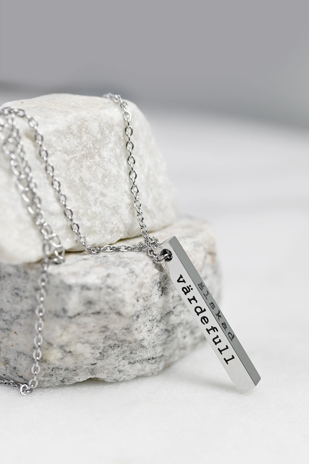 Hänget är en stav med ingraverad text: Älskad, värdefull, dyrbar på varsin sida och ett hjärta på den sista.