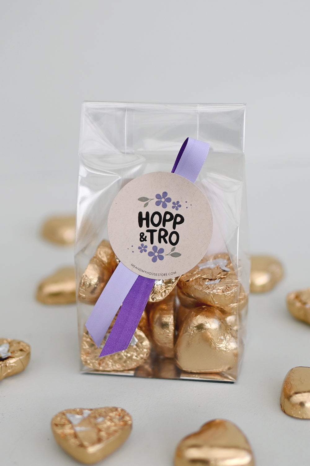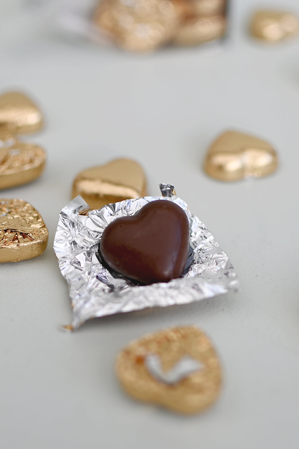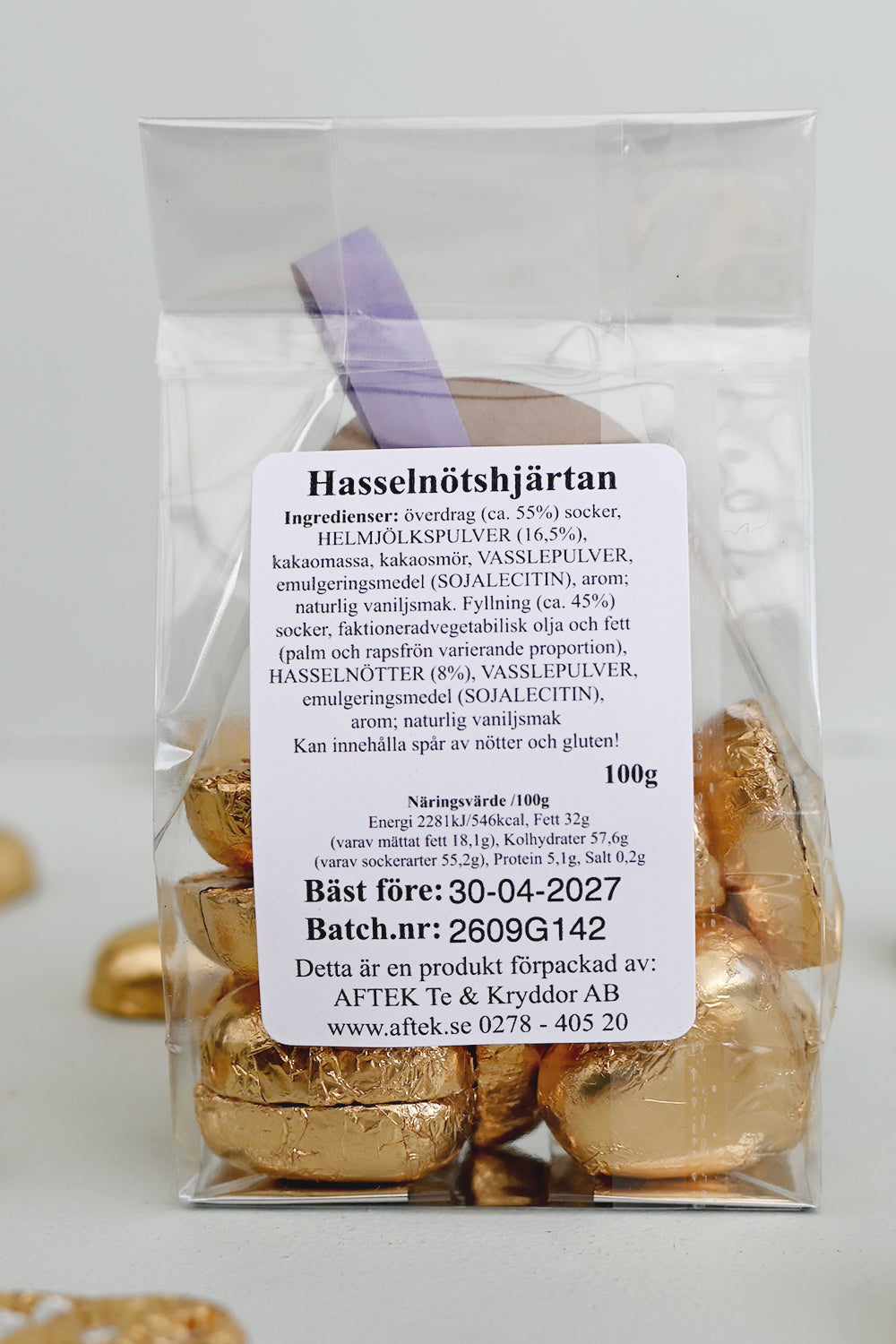 Söt påse med len hasselnötschoklad, formade till vackra hjärtan med guldfolieomslag.