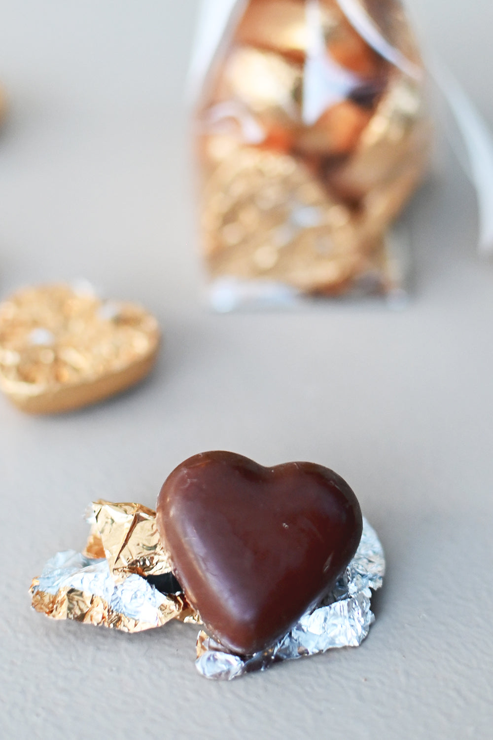 Söt påse med len hasselnötschoklad, formade till vackra hjärtan med guldfolieomslag.