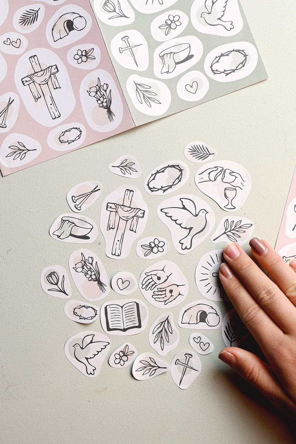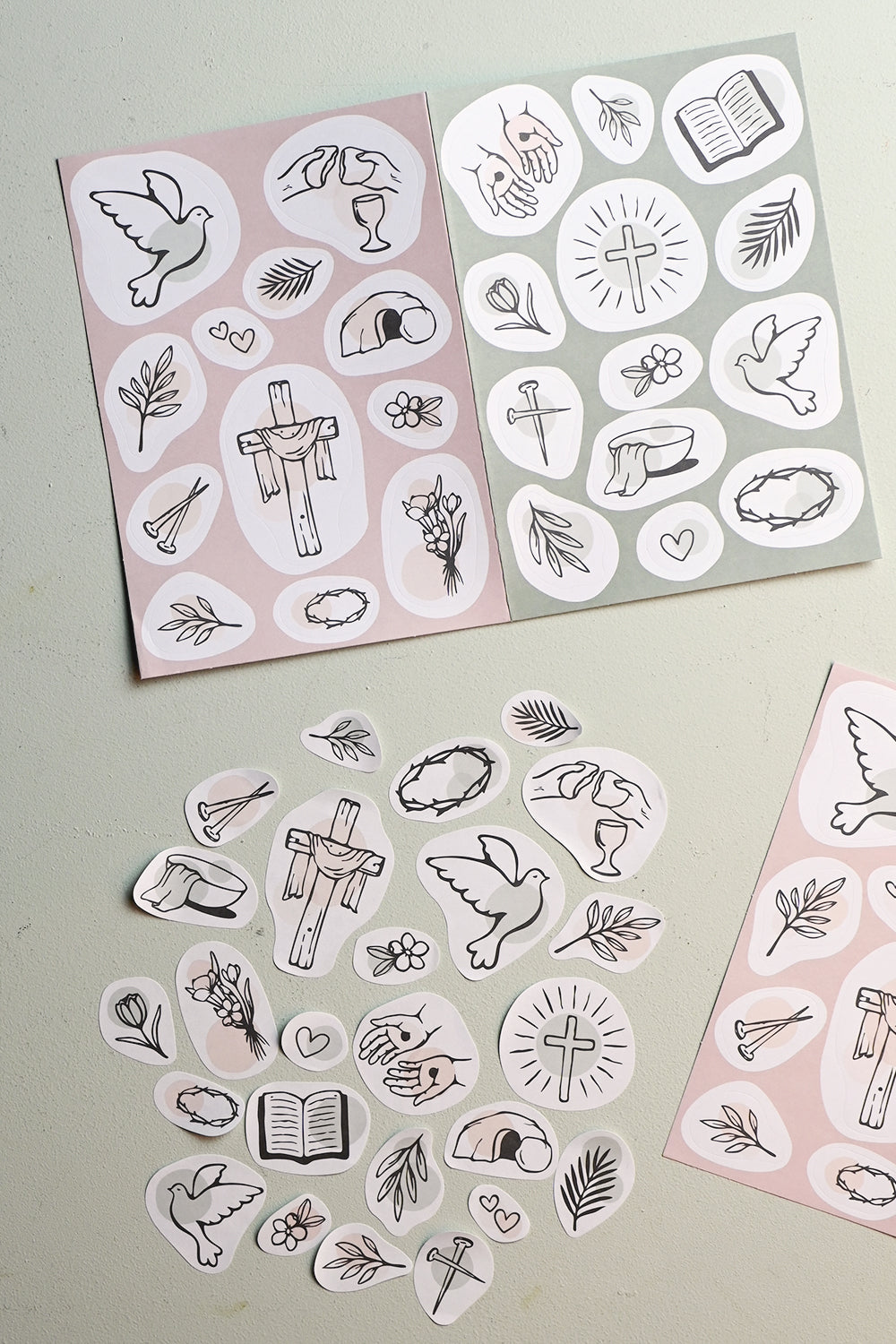 Detta ark är fullt av bilder med anknytning till påsken. Kors, duvor, spikar, törnkrona, brödsbrytelse, sårade händer, en tom grav, blommor, blad och palmkvistar.