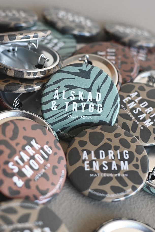 Ett härligt kit med knappar på djurmönstrad botten. Texterna är "Stark & modig", "Aldrig ensam" och "Älskad & trygg" och har varsin bibelhänvisning.