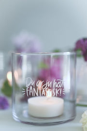 Vacker ljuslykta i glas med motiv i vitt mitt fram.