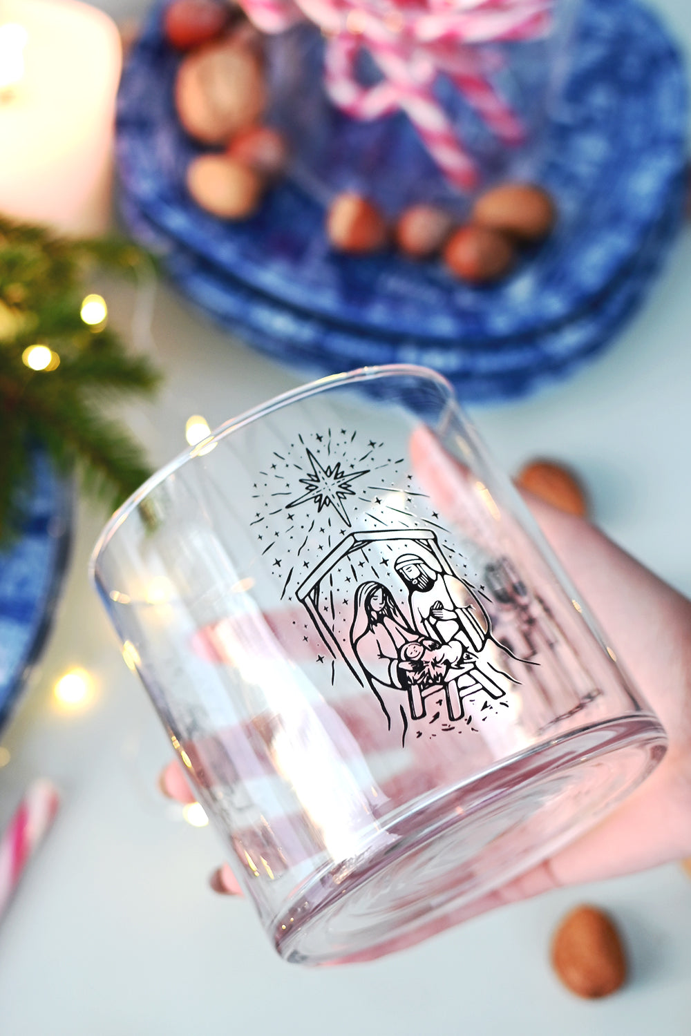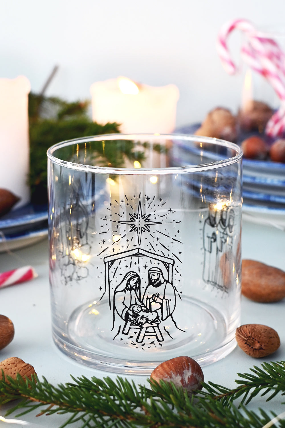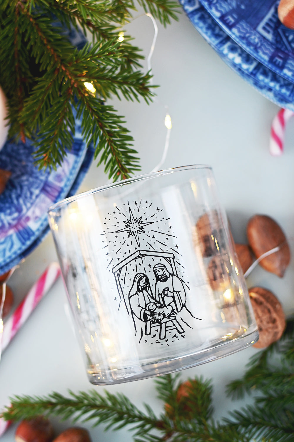 Vacker ljuslykta i glas med tre svarta tryck runt lyktan. Första bilden föreställer Jesusbarnet med Josef och Maria, bilden till vänster är herdarna och bilden till höger är de vise männen.