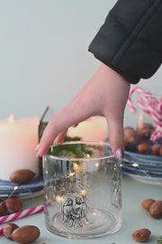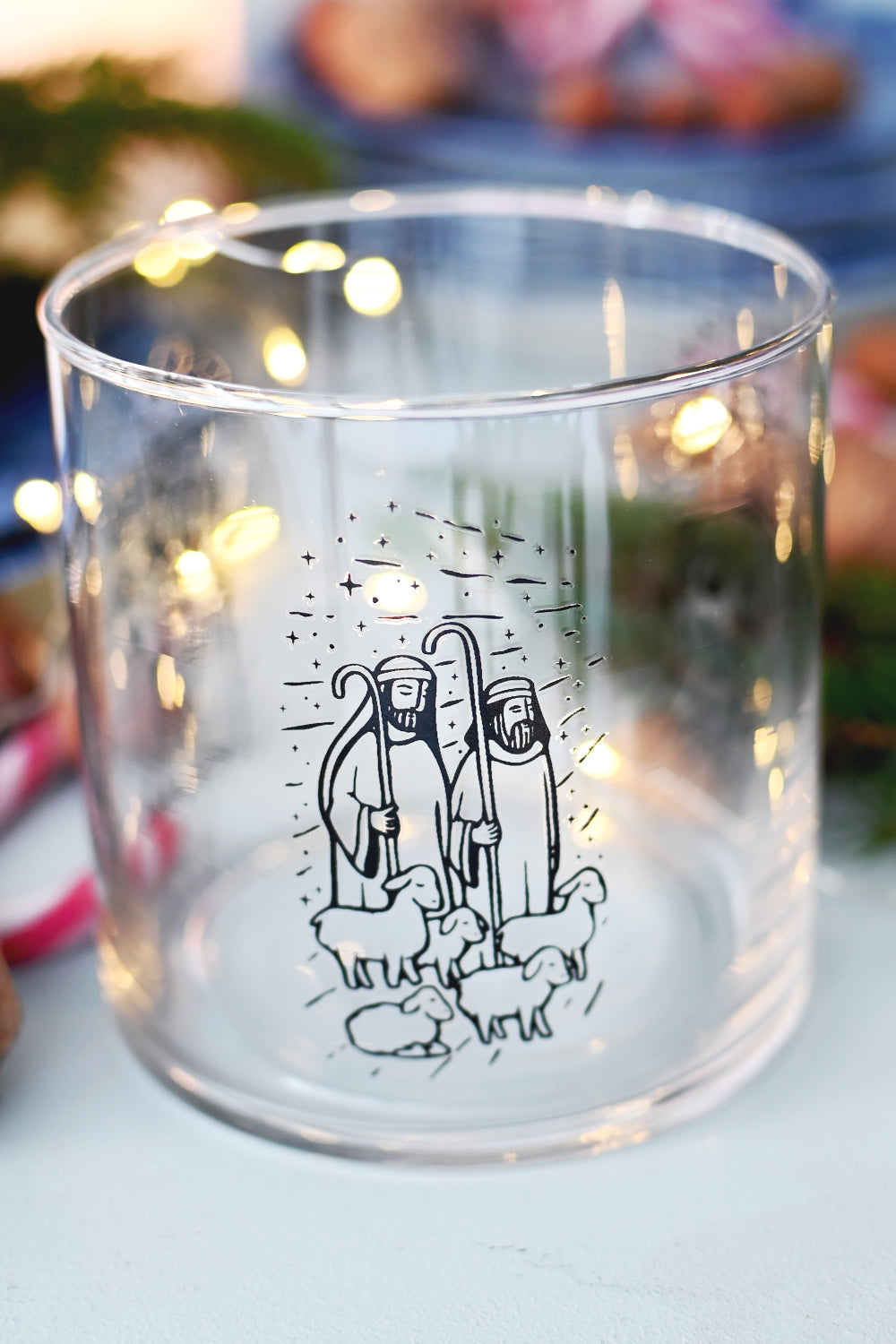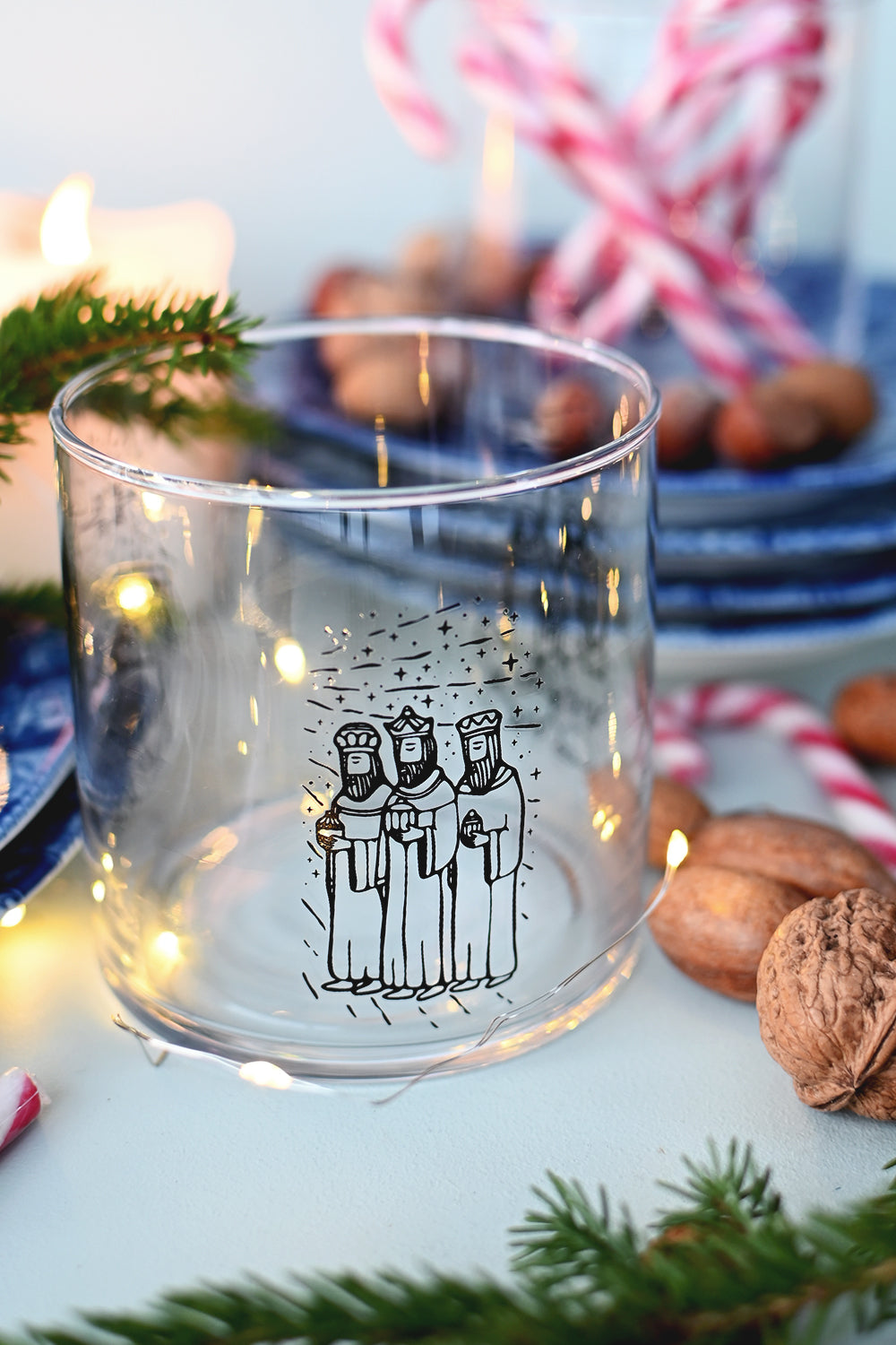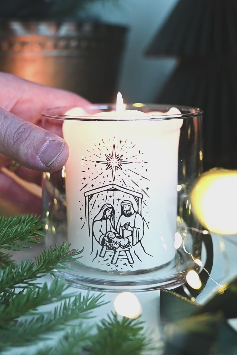 Vacker ljuslykta i glas med tre svarta tryck runt lyktan. Första bilden föreställer Jesusbarnet med Josef och Maria, bilden till vänster är herdarna och bilden till höger är de vise männen.