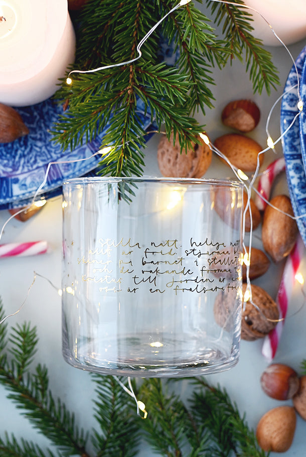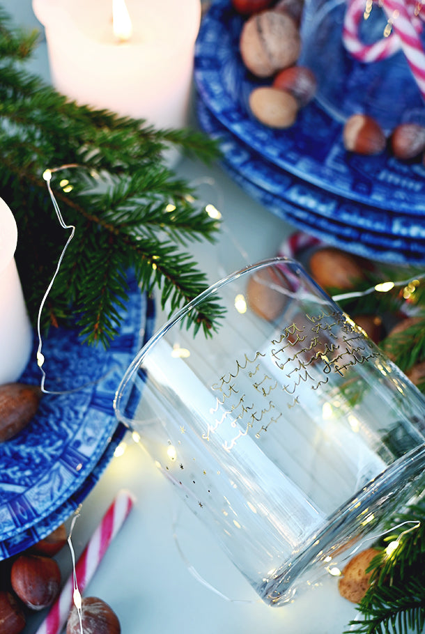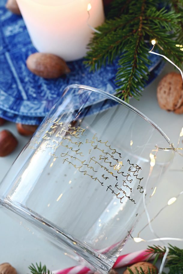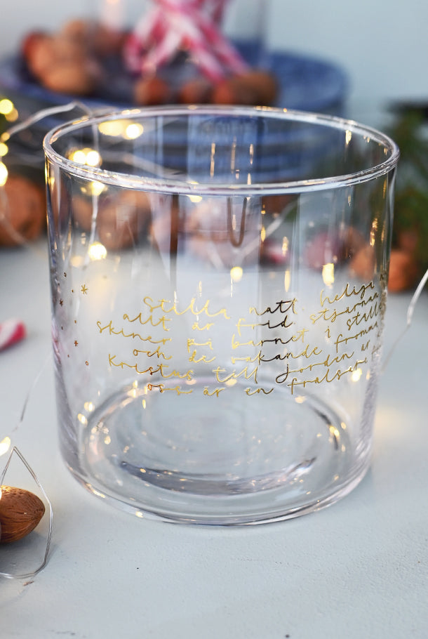 Vacker ljuslykta i glas med glimmande guldtryck runt hela lyktan.