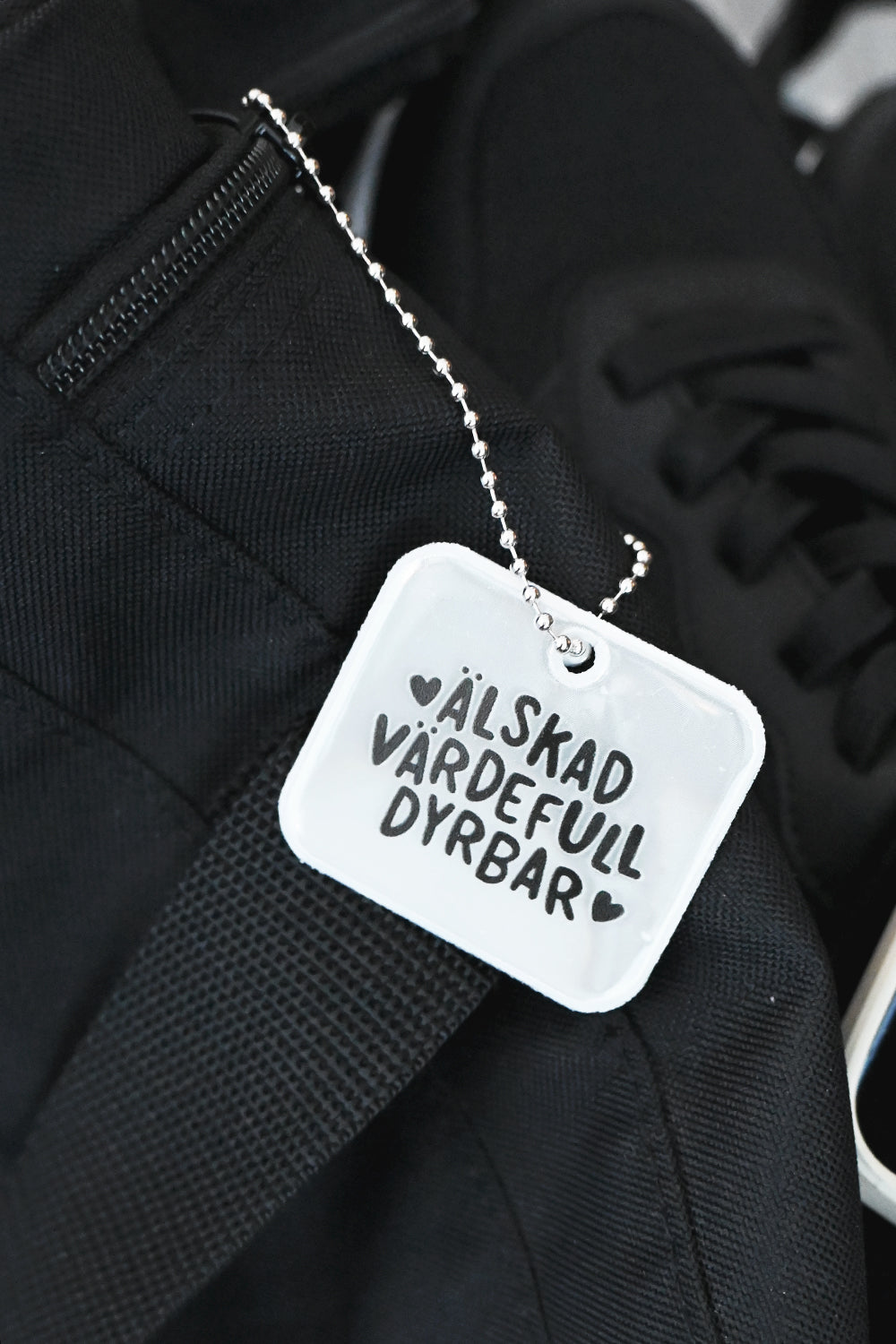 Reflexen är 50 x 40 mm stor och kedjan är 20 cm lång. Nyp åt metallöppningen rejält när du fäst kedjan.