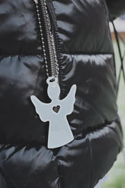 Ängeln är 51 x 65 mm stor och kedjan är 18 cm lång. Nyp åt metallöppningen rejält när du fäst kedjan. Det är ingen text på denna reflex.