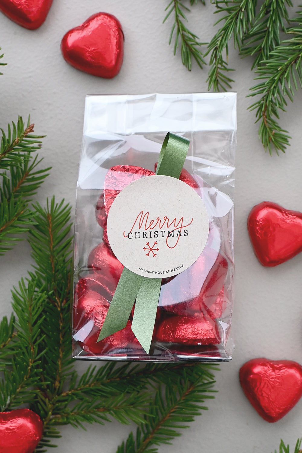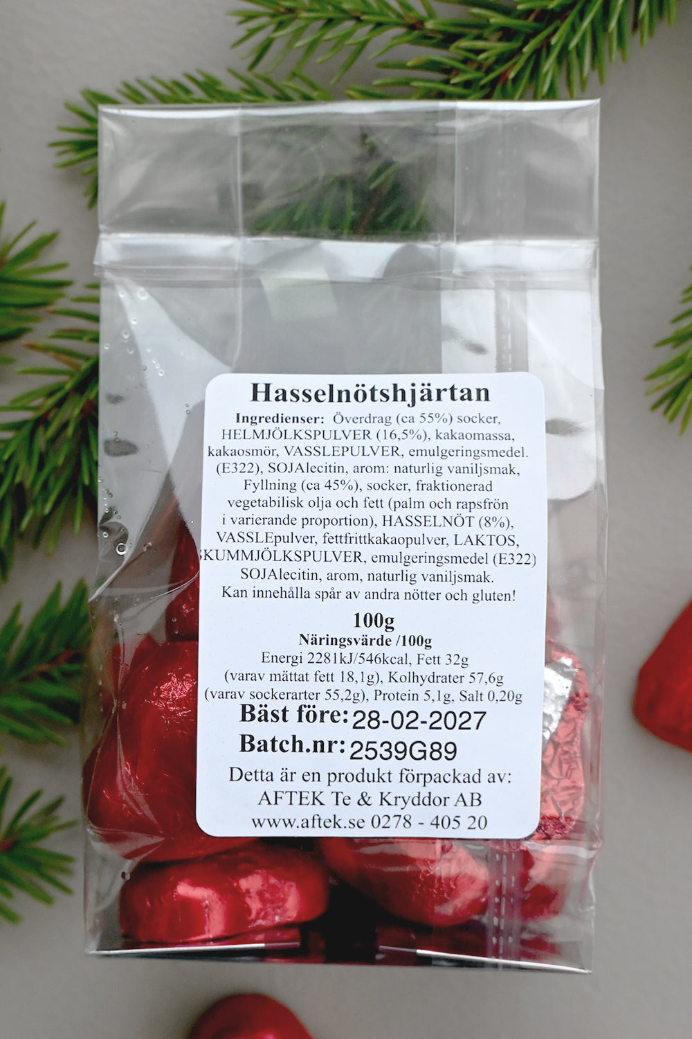 Söt påse med len hasselnötschoklad, formade till vackra hjärtan med rött folieomslag.