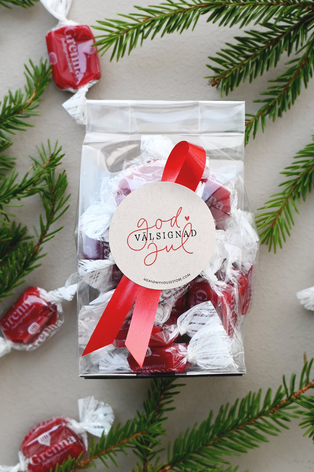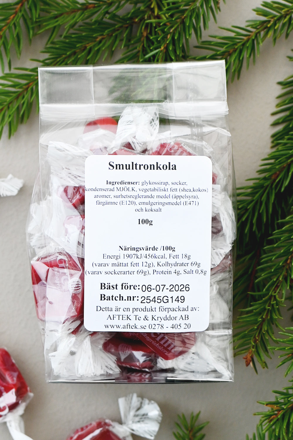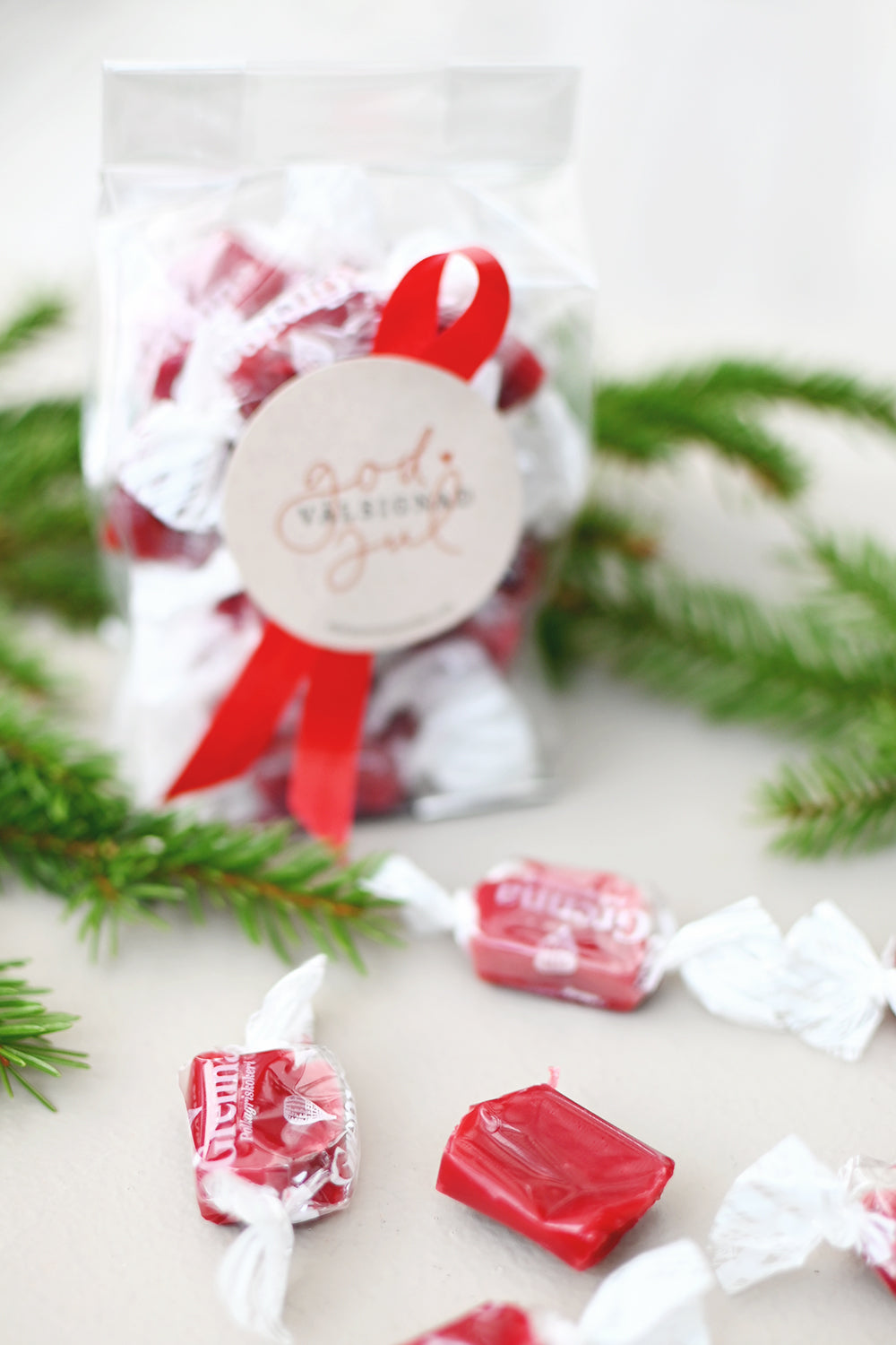 Söt påse med seg och god, styckpackad smultronkola från Grenna Polkagriskokeri.