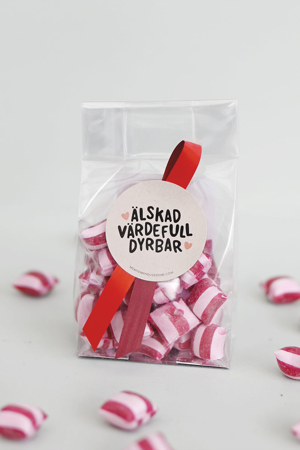 Söt påse med klassiska polkagrisar, men med oklassisk smak av smultron.