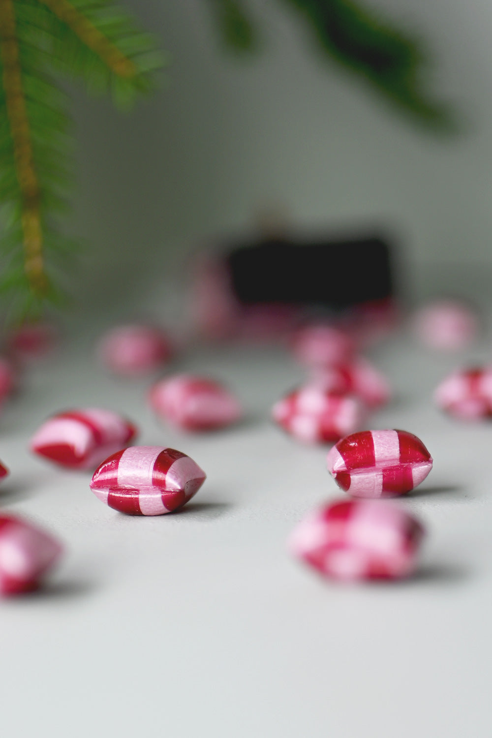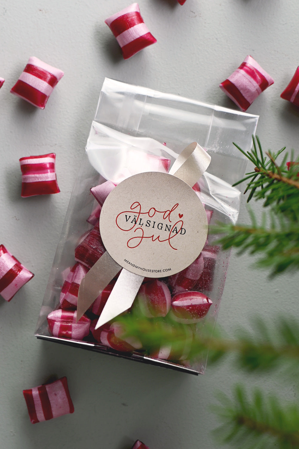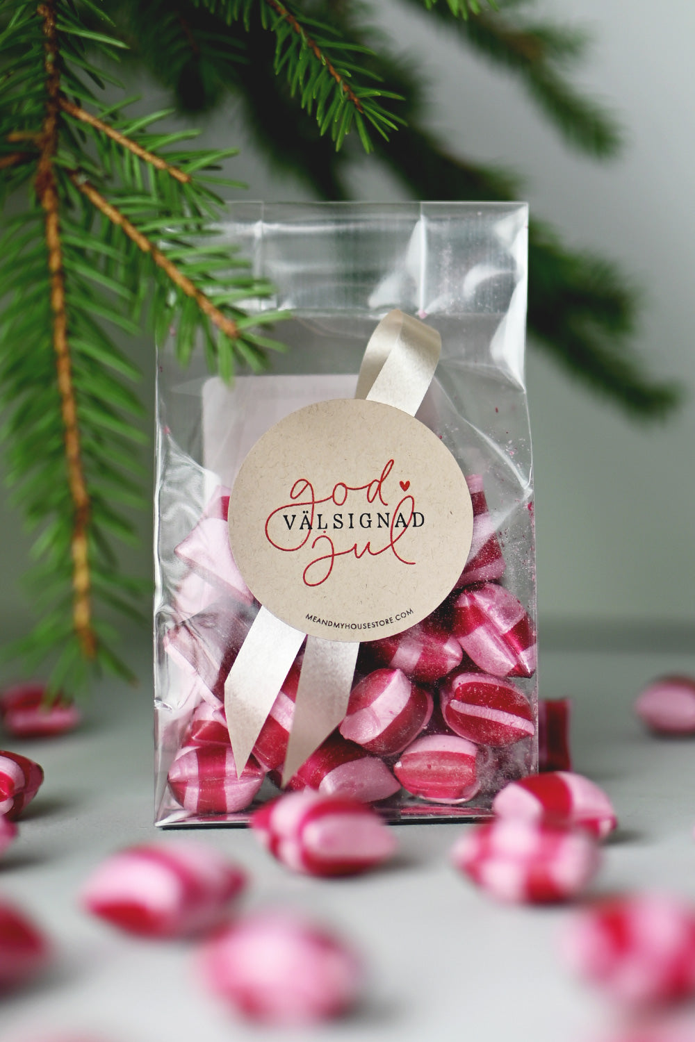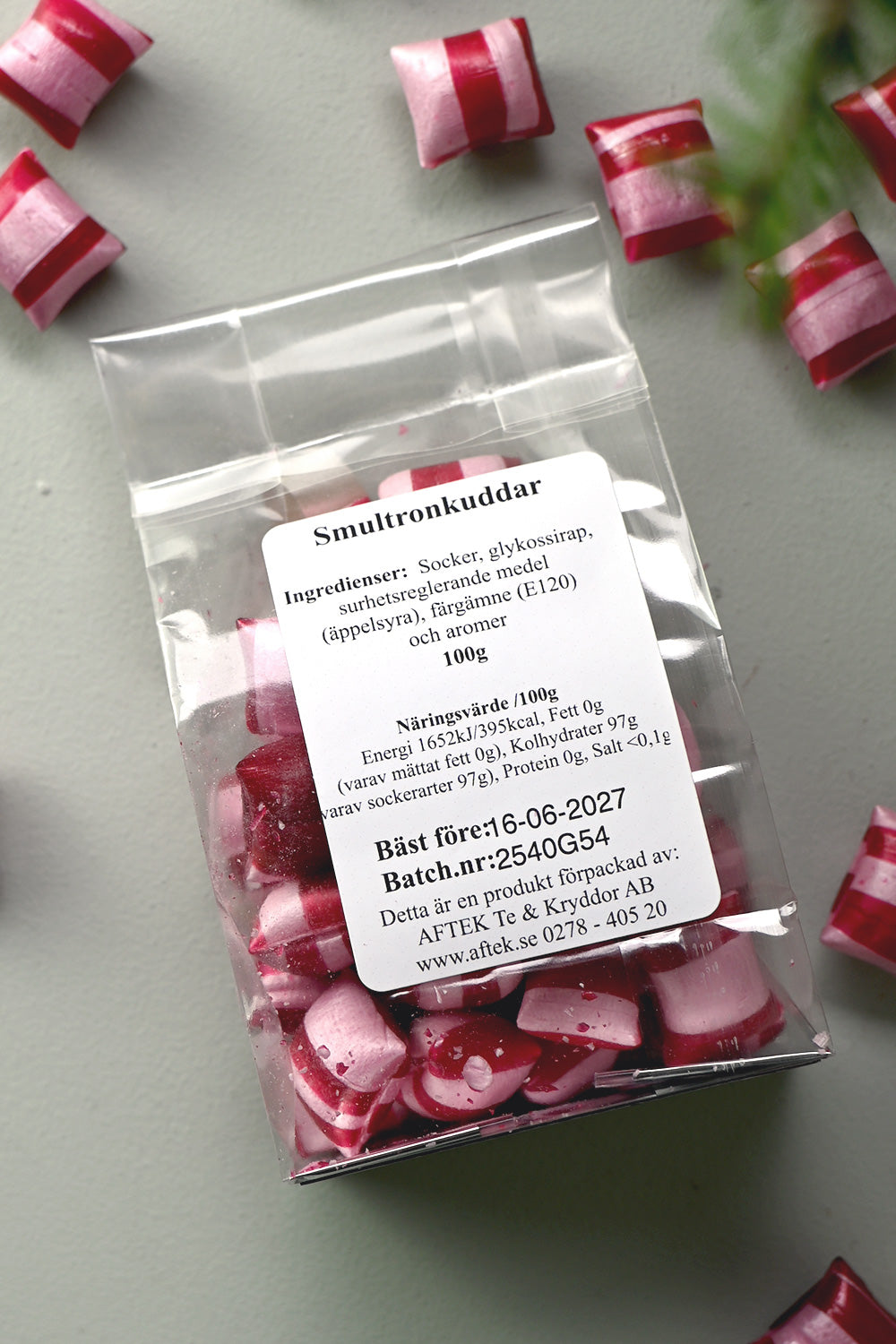 Söt påse med klassiska polkagrisar, men med oklassisk smak av smultron.