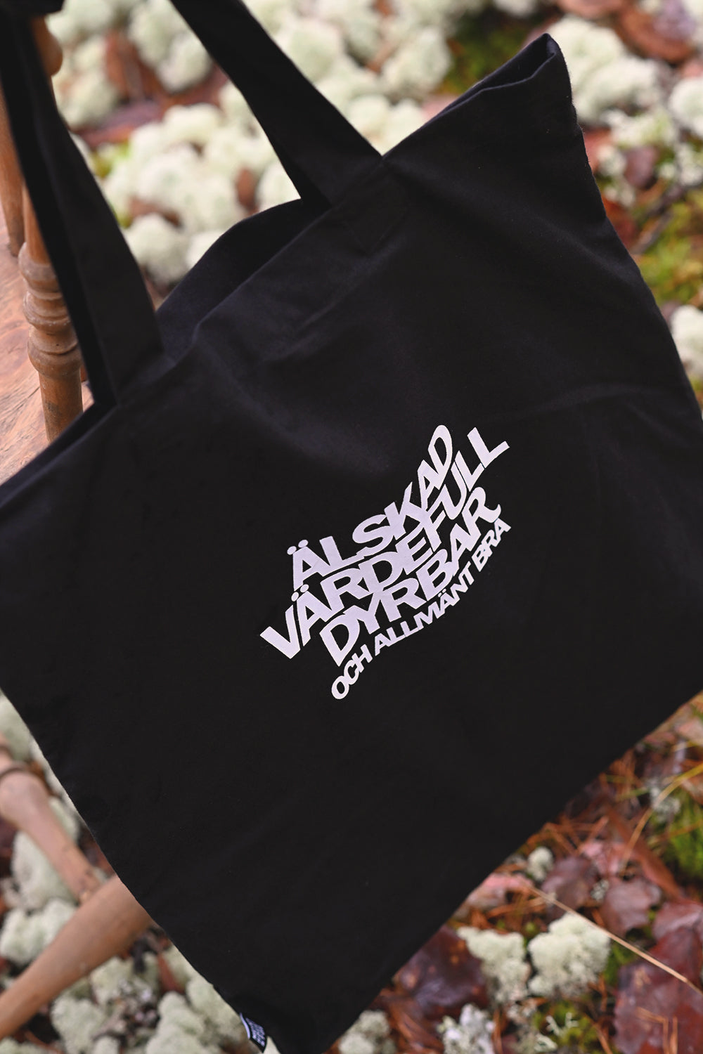- Tygkassen är sydd i ekologisk, oblekt bomull och tryckt med miljövänlig färg.
