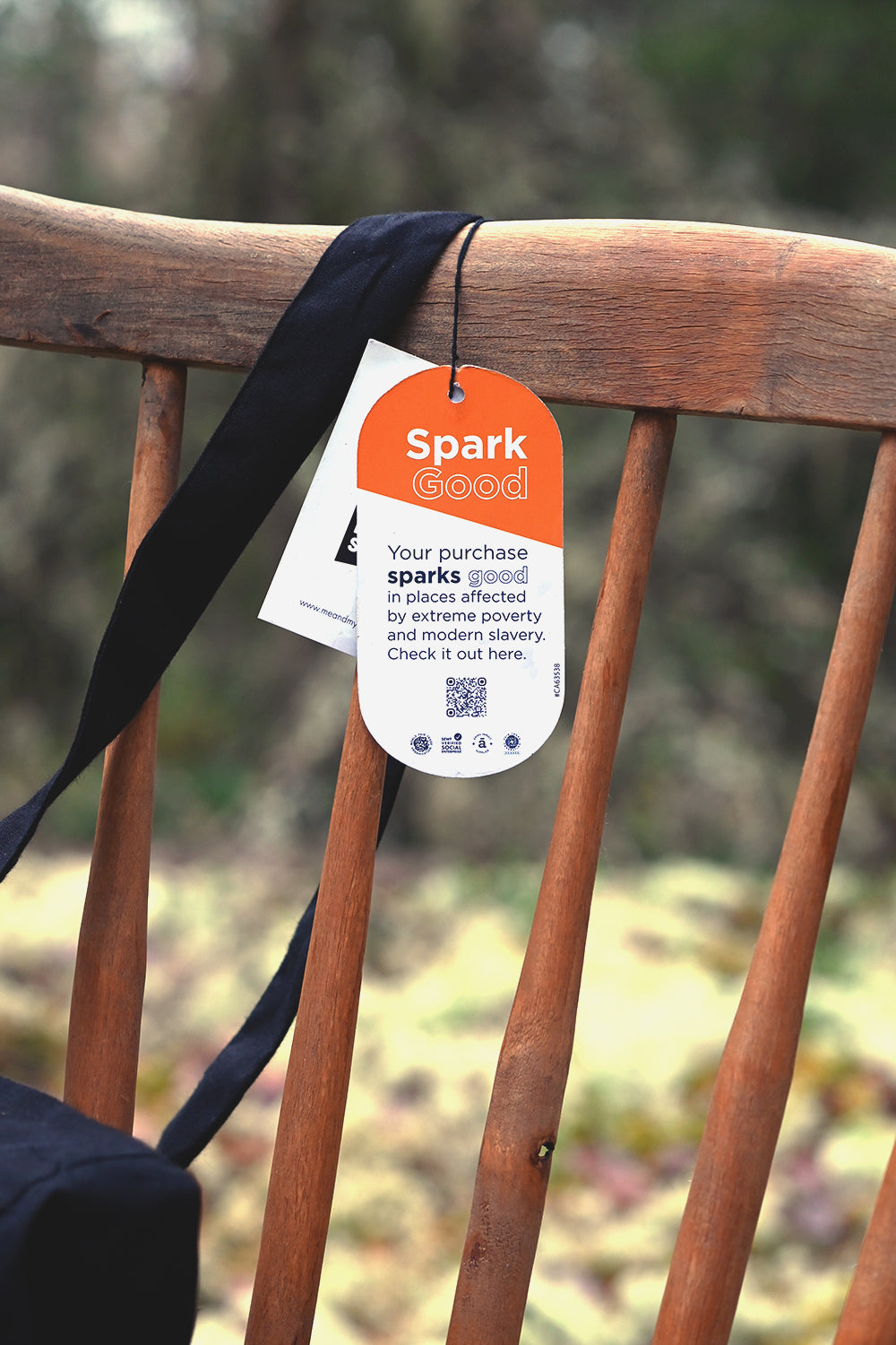 Tygkassen är sydd genom ett hjälpprojekt i Kolkata, Indien, som hjälper kvinnor med bakgrund i trafficking eller extrem fattigdom till nytt liv, stygn för stygn. Vi har själva besökt projektet och träffat flera av kvinnorna som arbetar här, så det känns extra roligt att få sälja dessa tygkassar som vi faktiskt vet gör skillnad.