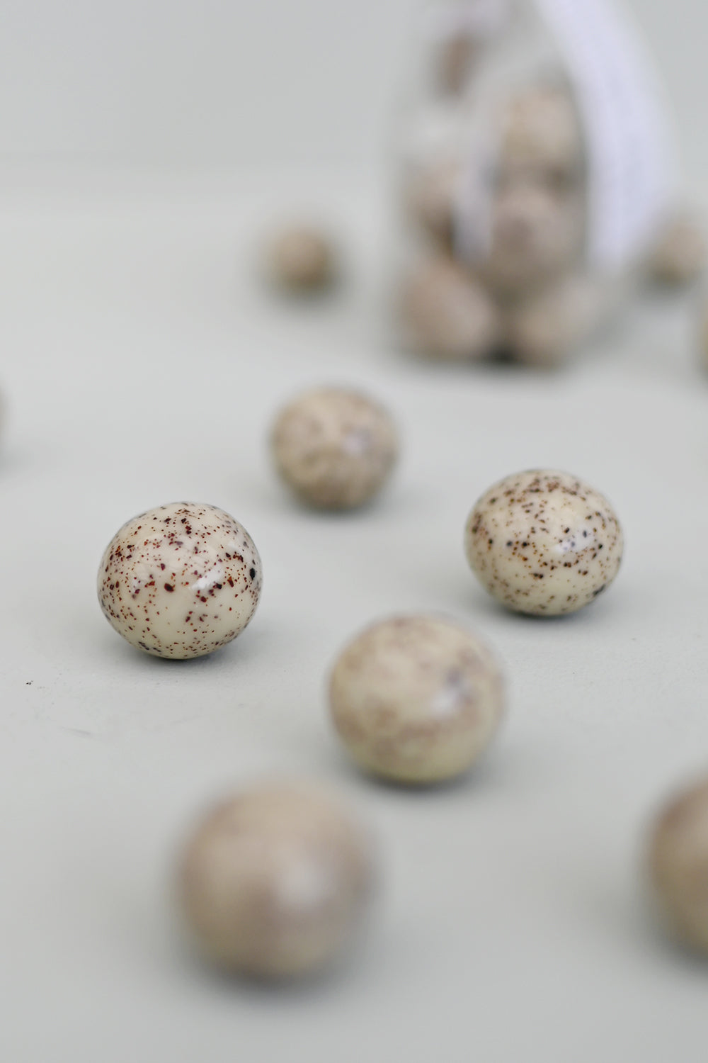 Söt påse med goda kolasmakande lakritskulor täcka med vackert mönstrad choklad.