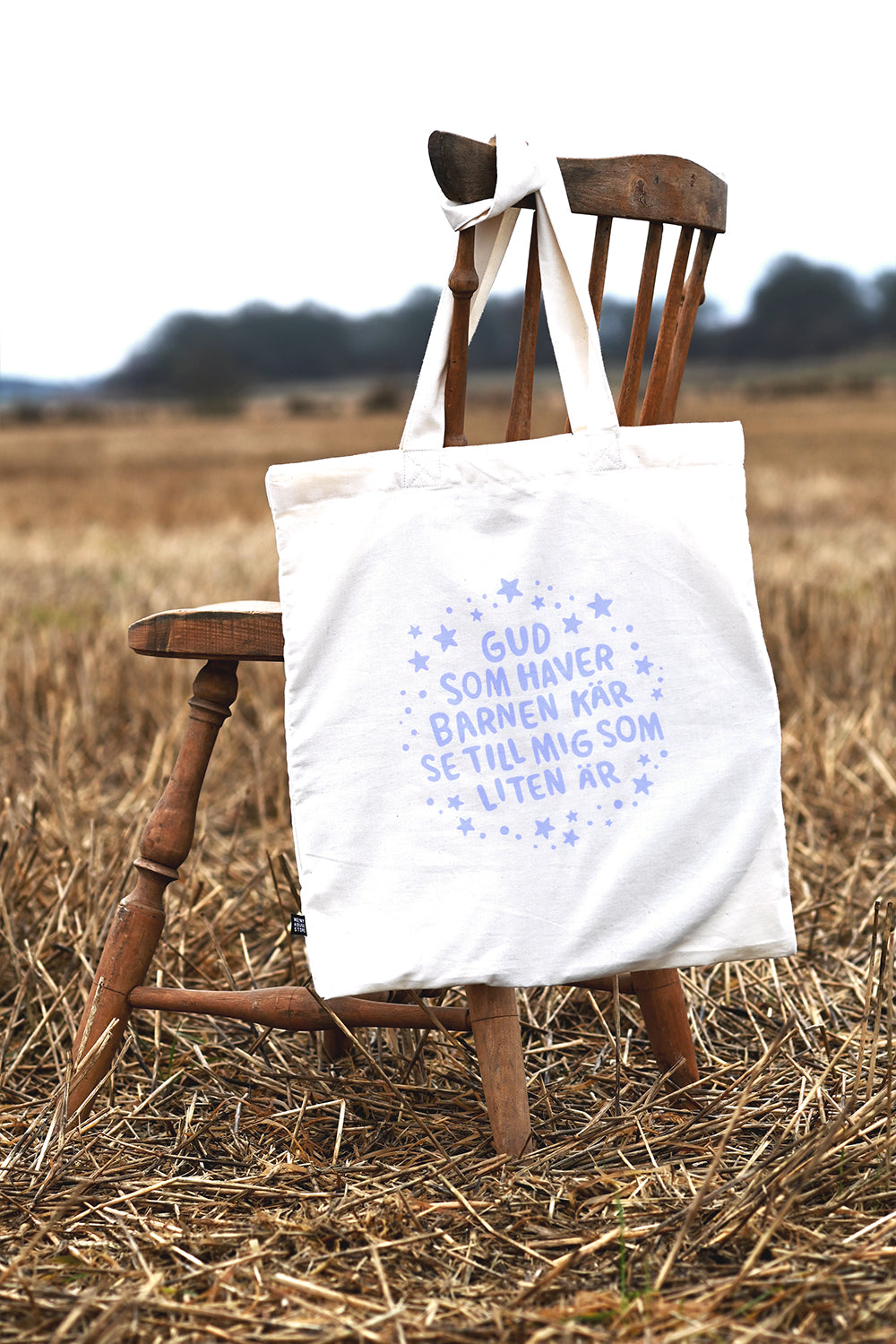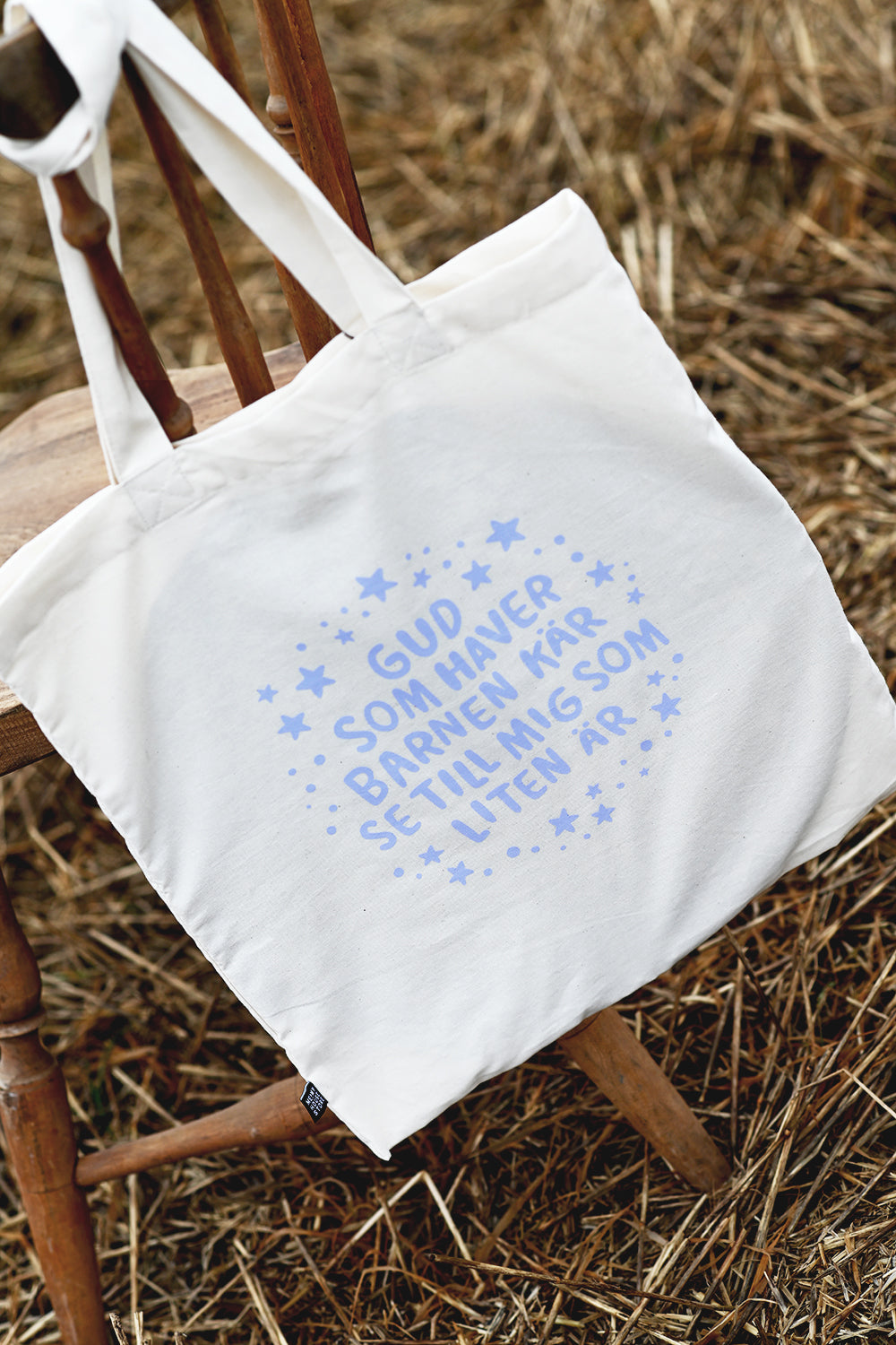 - Tygkassen är sydd i ekologisk, oblekt bomull och tryckt med miljövänlig färg.