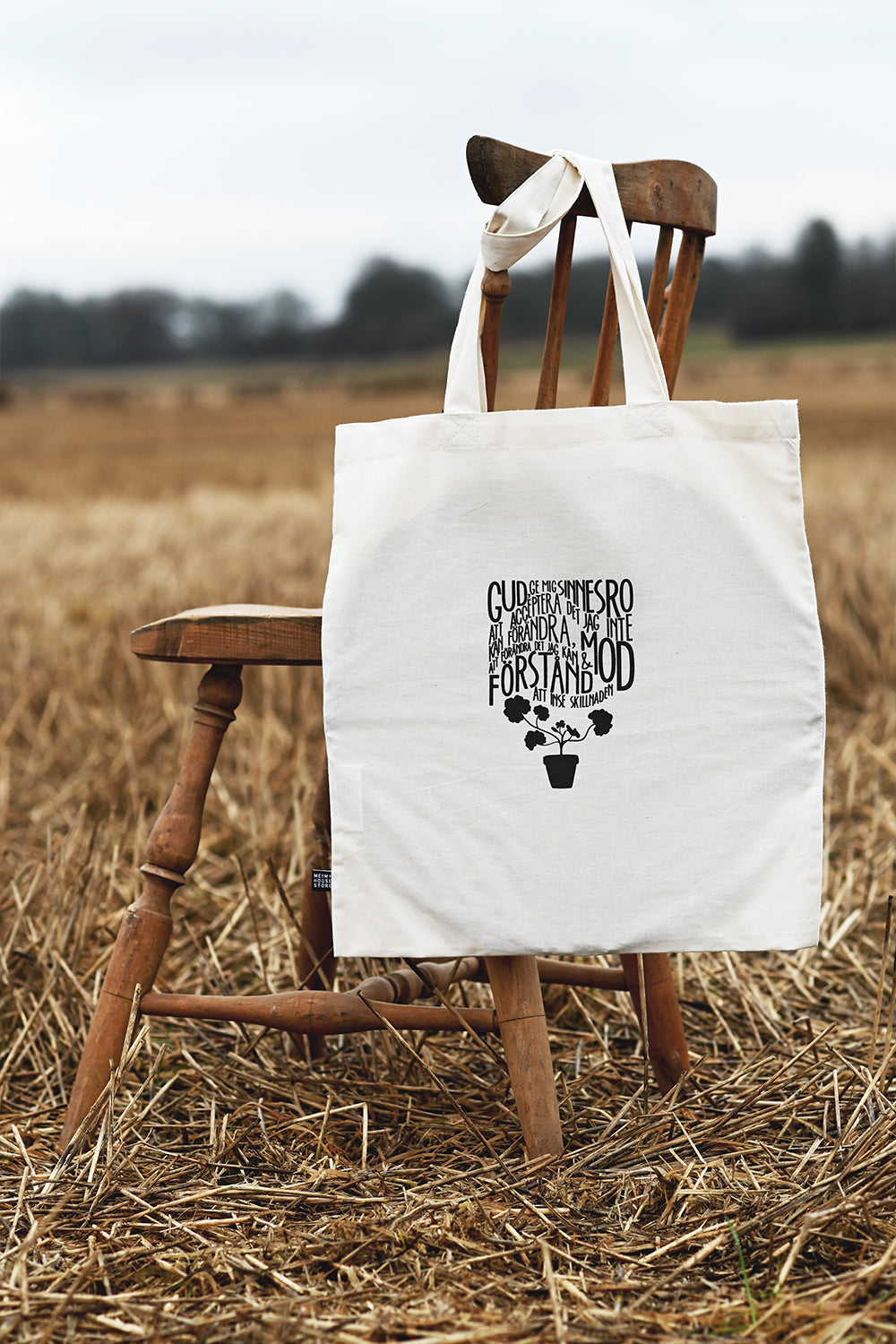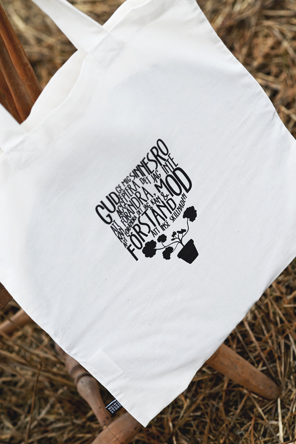 - Tygkassen är sydd i ekologisk, oblekt bomull och tryckt med miljövänlig färg.